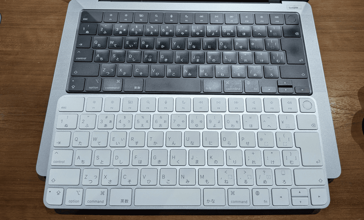 僕の場合、自席では外付けの Magic Keyboard を使い、会議室などに移動して作業するときは MacBook の内蔵キーボードを使っています。そのときにキーボードの配列やキーストロークが違うと、頭の切り替えが大変で……💧